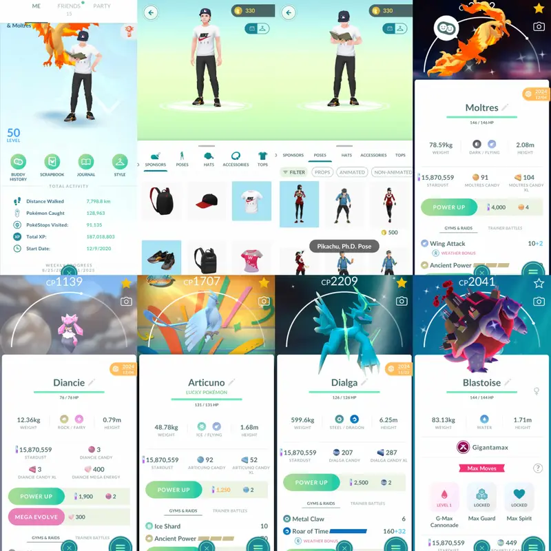 With a Total XP of 187,018,803, a Stardust reserve of 15,870,559, and nearly maxed Pokémon Storage (2231/2300), this account is a dream for any Pokémon aficionado. It features 71 Hundo (4*) Pokémon, 36 Shiny Legendary, Mythical, and Ultra Beasts, along with a diverse collection of costume and event Pokémon, positioning you to excel in the Pokémon GO universe.