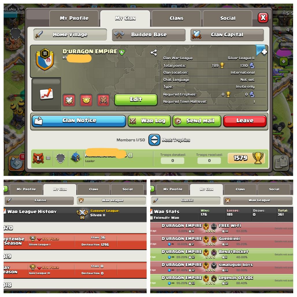 CLAN LEVEL 11 NICK GOOD|D'URAGON EMPIRE|WIN 176|LOSE 185|CWL SILVER II|FAST DELIVERY