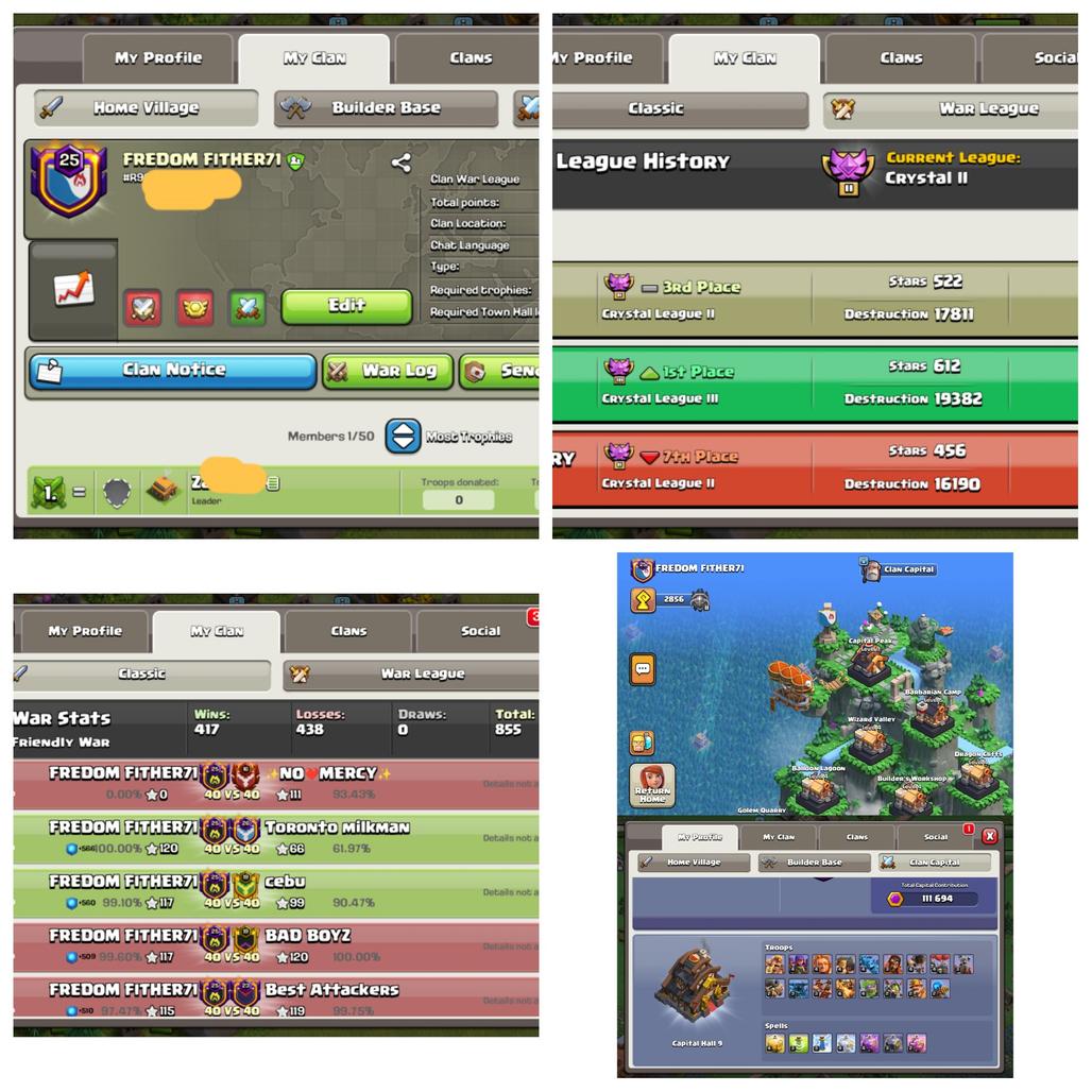 CLAN LEVEL 25 NICK GOOD|FREDOM FITHER71|CH LVL 9 TROPS GOOD|WIN 417|LOSE 438|CWL Crsytal II|FAST DELIVERY